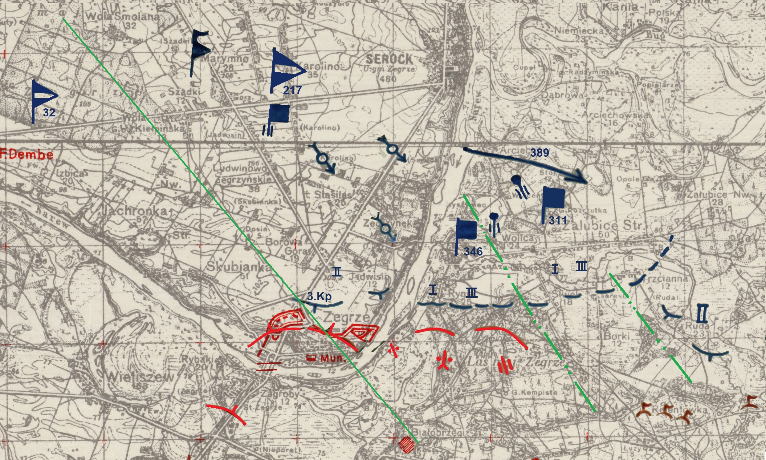 KTB I.A.K.: 9.15 Uhr Lagebericht 217.Div. Anlage 217.I.D. Ia an I.A.K. 1.) Feind in Laz may Zegrze etwa 2 Btl. Fdl.Kav.etwa 300 Mann in Radzymin (Angabe eines Gefangenen bei M.G.Btl.9). 2.) Brückenkopfstellung in Linie nördl.Rynia - Zalubice-Str. - Zalubice Nw. Bis 24.00 Uhr 3 Inf.Rgt.und 3.l.Artl.Abt. übergesetzt. 3.) Verluste: unleserlich 12 Tote, 110 Verwundete 4.) Absicht für 14.9. Angriff mit 2 v.Inf.Rgt.ostw.des Laz may Zegrze auf Radzymin. Abwehr mit 1 Inf.Rgt. gegen Laz may Zegrze. ...unleserlich.... 5.) Div.Gef.Std.: Marynino Lagebericht 217.Inf.Div. 1.) Kampf des I.R.346 um Las may (?) Zegrze durch fdl.Artl.Feuer aus Zegrze und ..unleserlich... Fort Benjamino stark behindert. I.R.311 hat mit starken Teilen Borki Ruda erreicht. Feind im Wald südl.Ruda. 2.) I.R.389 beginnt gegen 12.00 Uhr mit Übersetzen. 3.) Absicht der Div.: Fortsetzung des Angriffs in Richtung nördl.Radzymin. Inmarschsetzung des I.R.389 nach begonnenem Übersetzen auf Trojany. 4.) Verluste bisher anscheinend ..unleserlich... 18.00 Uhr Lagemeldung vom M.G.Btl.9. Zu gleicher Zeit Lagemeldung von 217.Div. |