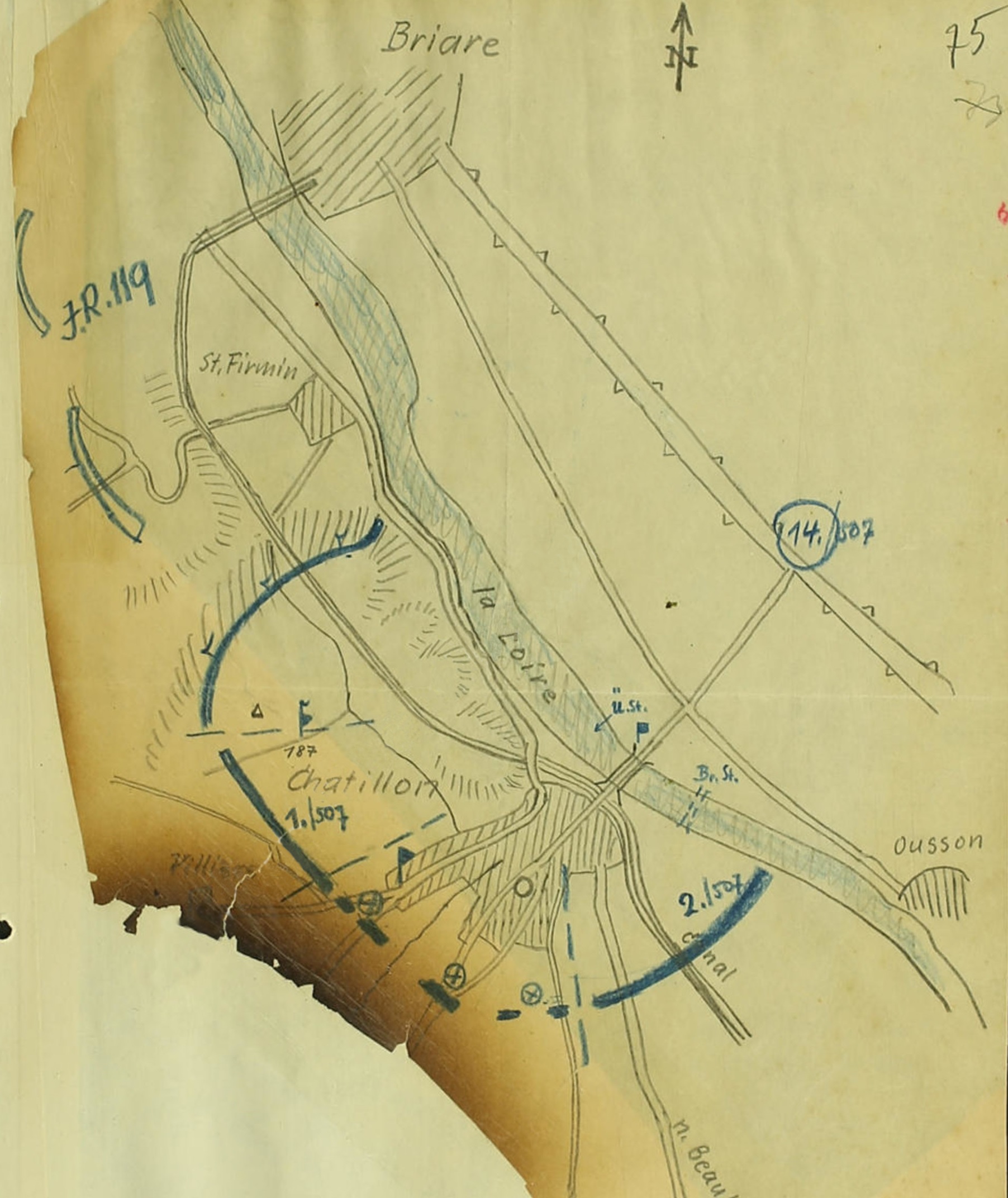 I.R.508 an Div.292 18.6.40, 09.00 Uhr: 09.05 Vorausabt.angetreten. I.R.508 an Div.292 18.6.40, 11.15 Uhr: Anfang der Marschgruppe 11.15 Perreux erreicht. I.R.507 an Div.292 18.6.40, 13.40 Uhr: Rgt. hat 13.30 Uhr Villeneuve erreicht. Rast bis 16.00 Uhr. Voraus an 292.Inf.Div., 18.6.40, 13.50 Uhr: Spähtrupp zwischen St.Firmin und Chatillon ohne Feindberührung übergesetzt. Erkundung Westufer noch im Gange. Bilde auf Korpsbefehl an gleicher Stelle Brückenkopf. I.R.508 an 292.Inf.Div., 18.6.40, 14.15 Uhr. Nach beendeter Rast westlich Grand Champ 15.00 Weitermarsch. Voraus an 292.Inf.Div., 18.6.40, 15.00 Uhr: Meldung durch Kradmelder an Armee. Fliegermeldung 12.45 LKW Kolonne Vailly. 9 Fahrzeuge. Anfang im Ort Richtung La Capelle. Sonst nur Einzelfahrzeuge. 12.50 um La Chapelle alle Straßen belegt. -unleserlich- LKW, 14 Omnibusse, bespannte -unleserlich- und 4 Kompanien -unleserlich- westl.Richtung. -mehrere Zeilen verbrannt- Voraus an 292.Inf.Div., 18.6.40, 19.18 Uhr: Brückenkolonne 11 und 15 an Brückenkopf eingetroffen. Voraus an 292.Inf.Div., 18.6.40, 19.25 Uhr: Chatillon feindfrei. -unleserlich- in Brückenkopf eingezogen. Voraus an 292.Inf.Div., 18.6.40, 19.35 Uhr: Laut Flakoffizier ein Zug zum Brückenschutz zu schwach. Erbitte Einsatz eines zweiten Zuges. Umgehend Antwort. Voraus an 292.Inf.Div., 18.6.40, 20.00 Uhr: Brückenkopf gebildet von Wegegabel 300 mtr.südwestl. Pkt.187 bis südwestl.Rand Chatillon. Teile zur Bildung Brückenkopf nordwestl. Pkt.187 -unleserlich- Brückenkopf 96 -unleserlich- im Anmarsch. Voraus an 292.Inf.Div., 18.6.40, 20.35 Uhr: Oberst Scherer soeben eingetroffen. I.R.508, Gef.St.Villeneuve Schule, an 292.Inf.Div., 18.6.40, --- Uhr. 1. Unterkunftsraum s.umseitige Skzze. 2. Truppe hat um 19.30 den Raum erreicht. 3. Durch Radfahrzug während des Vormarsches Verbindung mit 96.ID aufgenommen. a) Div.Gef.St. bis 16.00 Uhr in Joigny. b) IR.287 marschierte um 1400 durch Villers St.Beuris nach Mezilles. c) Heute erreichte vordere Linie wahrscheinlich nordostwärts Le Loing Fluss. -mehrere Zeilen verbrannt- Voraus an 292.Inf.Div., 18.6.40, 21.00 Uhr: Zehn Schützen im Zurückgehen auf Straße 130. Les Albides. Batterie 4 Geschütze bespannt geht in Richtung Argent. -unleserlich-straße fast unbelegt. 13.15 LKW Kolonne 12 Fahrzeuge stehen bei -unleserlich- Nachbarabschnitt Argent - -unleserlich- in Ordnung. -mehrere Zeilen verbrannt. Voraus an 292.Inf.Div., 18.6.40, 21.41 Uhr: Pion.Komp.196 und Inf.Rgt.507 außer Kdr. und Radfahrzug noch nicht eingetroffen. -mehrere Zeilen unleserlich- Voraus an 292.Inf.Div., 18.6.40, 22.22 Uhr: Radfahrzug übergegangen. 1.Komp. im Übersetzen. Verbindung rechts aufgenommen. Brücke im Bau. Alles in Ordnung. Voraus an 292.Inf.Div., 18.6.40, 23.15 Uhr: Cernoy feindfrei. |