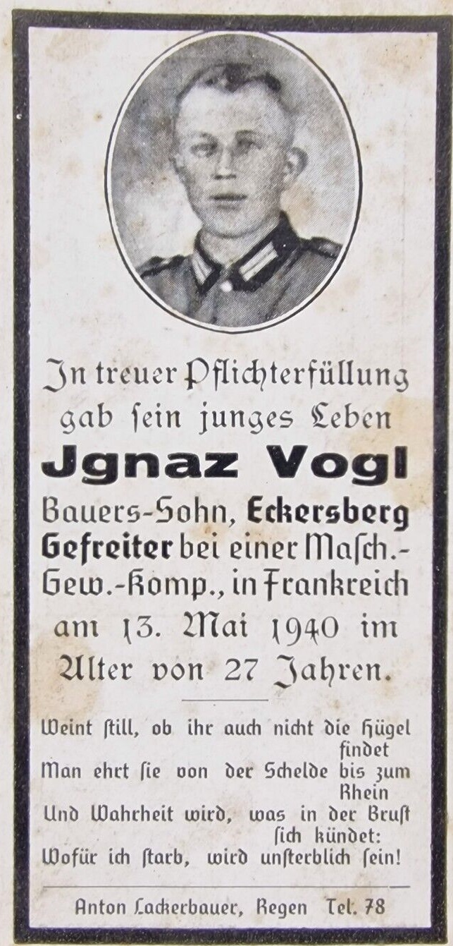 | Vogl Ignaz | 13.5.40 gefallen A.G.K., Höhe 420 bei Wollmering Frkr.(Gfr.), Grablage Div.Frdhf.Johannesberg b.Budesberg Lux.; | geb.29.4.13 | |