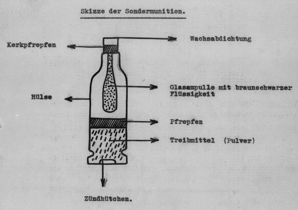 O.U. Zdunska Wola, den 8.9.39 Ic/A.O. Nr.5./39 An 10.Division, 17.Division, Leibstandarte Adolf Hitler Es ist in der Beutemunition zwischen normalen Inf.Patronen französischer Herkunft Sondermunition (s.anliegende Skizze) gefunden worden. Derartige Patronen sind beschleunigt zum Korps-Kommando XIII zuszusenden. Es ist durch Gefangenenaussagen feststellen zu lassen: 1. wieviel Patronen dieser Art sind vorhanden, 2. woher stammen die Patronen, 3. was enthält die Ampulle, 4. Verwndung der Patrone, 5. welcher Zweck soll damit erreicht werden? ![]() |