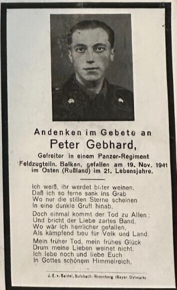 | Gebhard Peter | 19.11.41 gefallen Gusenewo, A.G.K., Grablage Feldgrab Strelino (Gfr.); | geb.:16.10.21 | ||