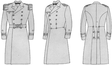 | Men and NCO´s without Portepee wear the Überzieher at bad or cold weather as far as no leather-jackets are issued. The Überzieher could also be worn with the Ausgehanzug in summer without the jacket underneath. Blue cloth; Golden buttons with imprinted anchors; national-insignia in golden silk; collar cornflower-blue cloth. Maate and Obermaate wear beside the rank-insignia a 0,5cm silver Tresse (Maat) or 2 silver Tressen (Obermaat) on the collar patch. |