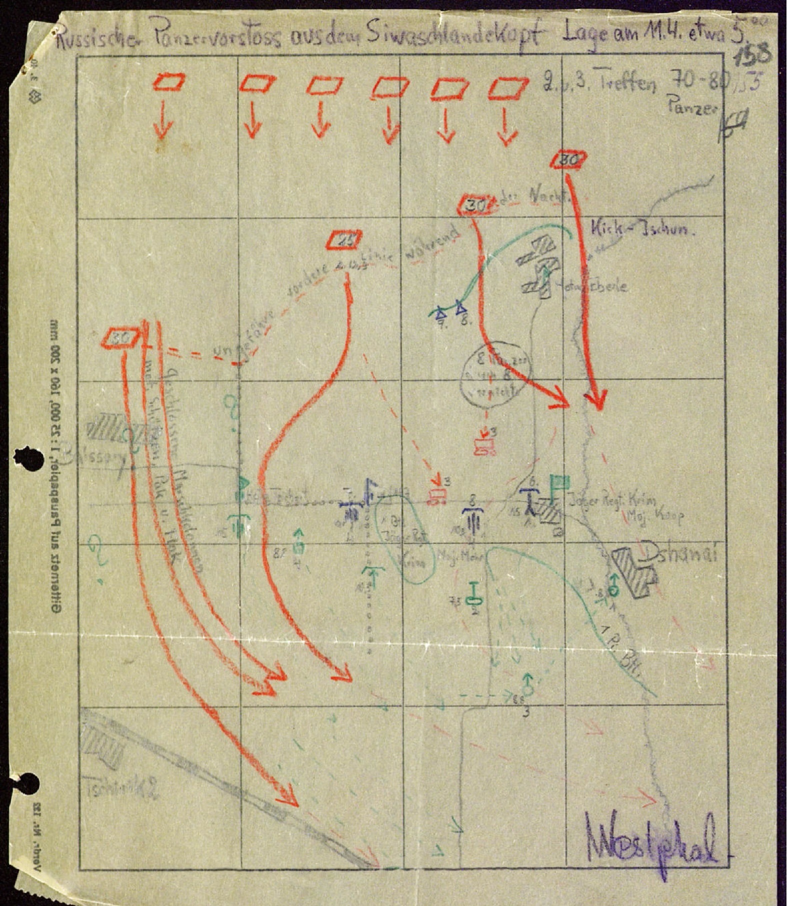 Abschlussbericht über die Kämpfe auf der Krim, Gen.z.b.V.OKH: Ein starker, in den ersten Morgenstunden des 11,4. mit großer Geschwindigkeit durchgeführter Panzerangriff des Gegners überrollte das Jäger-Rgt.Krim. Nur 25 Mann fanden sich später wieder zusammen. Der Gegner, der die schwache Stelle anscheinend erkannt hatte und seine Verstärkungen dorthin nachführte, stieß in einem Zuge bis an die Bahnlinie Dsankoi — Jshun vor. Die vorhandene Abwehr reichte gegen diese in schnellster Fahrt angreifenden Panzer-Massen nicht aus. Die Abwehr war vor allem durch fehlende Sicht (Staub) behindert. Der Versuch, die Nordfront zu halten, war nunmehr bis zum letzten ausgeschöpft. Die Armee hatte alle Reserven verausgabt. Der übermächtige Druck des Gegners erstickte nacheinander alle eigenen Versuche, ihn zum stehen zu bringen. Infolge seiner größeren Beweglichkeit war der Feind stets schneller wirksam als die eigenen zum Gegenstoß angesetzten Reserven. Zum Auffangen des feindlichen Stoßes bei der 10.rum.Division wurden insgesamt nacheinander eingesetzt: 7 deutsche und 3 rum. Bataillone, 7 Batterien, 25 Flakbatterien, 1 4,5cm und 1 2cm Batterie, 22 Sturmgeschütze. Die in die Enge von Jshun zurückgenommene 50.I.D. wurde am 11.4. ebenfalls stark angegriffen, sie war fest in der Hand ihrer Führer und hielt ihre Stellungen. Auch die 336. J.D. wies in der Tarchan-Stellung alle Angriffe erfolgreich ab. Durch das Vordringen in die Gegend südlich Tomaschewka hatte der Gegner bei der 10.rum.Div. den Austritt aus den Engen erzwungen. Der freie Raum der Krim lag vor ihm. Die Armee mußte sich nunmehr schlüssig werden, ob die Voraussetzungen für die Durchführung des Unternehmens "Adler" (erzwungene Räumung) gegeben waren. In der entstandenen Lage erschien ihr der Entschluß, mit den noch haltenden Teilen weiter an der Nordfront stehen zu bleiben, einer Vernichtung gleichzukommen. Sie entschied deshalb am 11.4. das Unternehmen „Adler” anlaufen zu lassen. Die Heeresgruppe stimmte zu. Der Führer genehmigte diese Absicht. Die Heeresgruppe befahl darauf (Ia Nr.1449/44 g.K. v.12.4.44): "Der Führer hat den Anlauf der Bewegung "Adler" genehmigt. Damit treten die in der Studie "Adler"-d.h. die erzwungene Räumung der Krim- festgelegten Maßnahmen in Kraft. Die Überführung aller Angehörigen der 17.Armee erfolgt auf dem Seeweg mit Masse nach Buzan" Damit hatte die Heeresgruppe über die Zurücknahme auf die erweiterte Festung Sewastopol und einen entscheidenden Kampf in ihr hinaus den Abtransport der 17.Armee nach dem Festland befohlen. Bericht über den russ.Panzerangriff am 11.4.44 zwischen Kirk-Ischun und bei Ssary, Hptm.Westphal: Die Abteilung (III./AR.117) stand in Stellung gemäß beiliegender Skizze. Auftrag war Halten der HKL gegen jeden Angriff in Zusammenarbeit mit der Kampfgruppe Major Kop. Die Abteilung war unterstellt dem A.R.117, Gefechtsstand in N.Alexandrowka, Drahtverbindung zum Regiment bestand bis gegen 2.30 Uhr. An deutschen Verbänden wurden im Kampfraum der Abteilung beobachtet: 1) 1 Btl. des Jäger-Regiments Krim Kommandeur Hptm.Eberle in Stellung hart nördlich bis etwa 1500m westlich Kirk-Ischun. Bei diesem Btl. je 1 V.B. der 7. und 8.Bttr. 2) 1 weiteres Btl.des Jäger-Regiments Krim Führung Major Mohr (?). Diese Btl. wurde während der Nacht zugeführt und erreichte den Abteilungsgefechtsstand gegen 3.00 Uhr im entfalteten Vorgehen. Im Augenblick des russischen Angriffs befand sich das Btl. noch nicht in seiner Stellung und war nicht abwehrbereit. 3) 1 Pionier-Btl. das zwichen 5.00 und 6.00 Uhr aus südostwärtiger Richtung den Raum hinter der Feuerstellung der 8.Batterie erreichte. 4) 2 Geschütze auf SFL der Panzerjäger-Abteilung 336. 5) 1 Heeresartillerie-Abteilung mot., Kdr. Hptm.Teichert in Stellung westlich und südlich der 7.Batterie. 6) 2 Batterien 8,8cm Flak davon eine seit dem Abend des 10.4.44 in Feuerstellung 500m südwestlich Feuerstellung 7.Batterie. Die andere wurde gegen 4.30 Uhr aus Richtung Nowo Alexandrowka kommend beobachtet und hielt vorübergehend 2km südlich Feuerstellung 8.?Batterie. Die Nacht verlief vollkommen ruhig, im Raum der Abteilung lag kein russisches Störungsfeuer. Bei Hellwerden herrschte zunächst Bodennebel, Sicht etwa 4000m. Die Sicht wurde aber mit Sonnenaufgang bald vollkommen klar. Eine halbe Stunde vor Sonnenaufgang, -unleserlich- wurden gegenüber der Feuerstellung der 7.Batterie und links davon in etwa 2000, Entfernung die ersten Panzer gesichtet. Sie bewegten sich in weit auseinander gezogenem Rudel (etwa 25 - 30 T 34) ohne Begleit- Infanterie langsam vorwärts. Etwa 15 Minuten später erschienen auch gegenüber der Feuerstellung der 8.Batterie 30 Panzer. Bei dieser Gruppe wurde aufgesessene Infanterie beobachtet und beigegebene Schützenpanzerwagen. Im Augenblick des Erscheinens der russischen Panzer machte die Abteilung Teichert Stellungswechsel nach rückwärts und wurde nicht mehr gesehen. Die 8,8cm Flak-Batterie in Nähe Feuerstellung 7.Batterie bekämpfte die anrollenden Panzer auf etwa 3000m mit etwa 10 Schuß ohne einen Treffer zu erzielen und verließ dann panikartig ihre Stellung unter Zurücklassung von 3 unzerstörten Geschützen. Die 7. und 8.Batterie nahmen die Bekämpfung der anrollenden Panzer auf etwa 3000m zunächst mit A.Z. auf. Unter dem Eindruck des Feuers wichen die Panzer vor der Batterie nach rechts aus und stießen eng geschlossen in einem Zuge etwa 1000m westlich von der Feuerstellung vorbei ins Hintergelände durch. Abschüsse konnten nicht erzielt werden, da die Batterie über keine Hl verfügte. Die Panzergruppe vor der 8.Batterie überrollte zunächst das Btl. Eberle, wobei 2 Panzer durch Nahbekämpfungsmittel vernichtet wurden. Im wirksamen Feuerbereich der 8.Batterie drehten auch diese Panzer ab und holten nach Osten aus. Hierbei wurden mit Sicherheit 5 T 34 abgeschossen. 4 Panzer wurden brennend beobachtet, bei einem Panzer Ausbooten der Besatzung und aufsteigende Rauchschwaden. Diese
