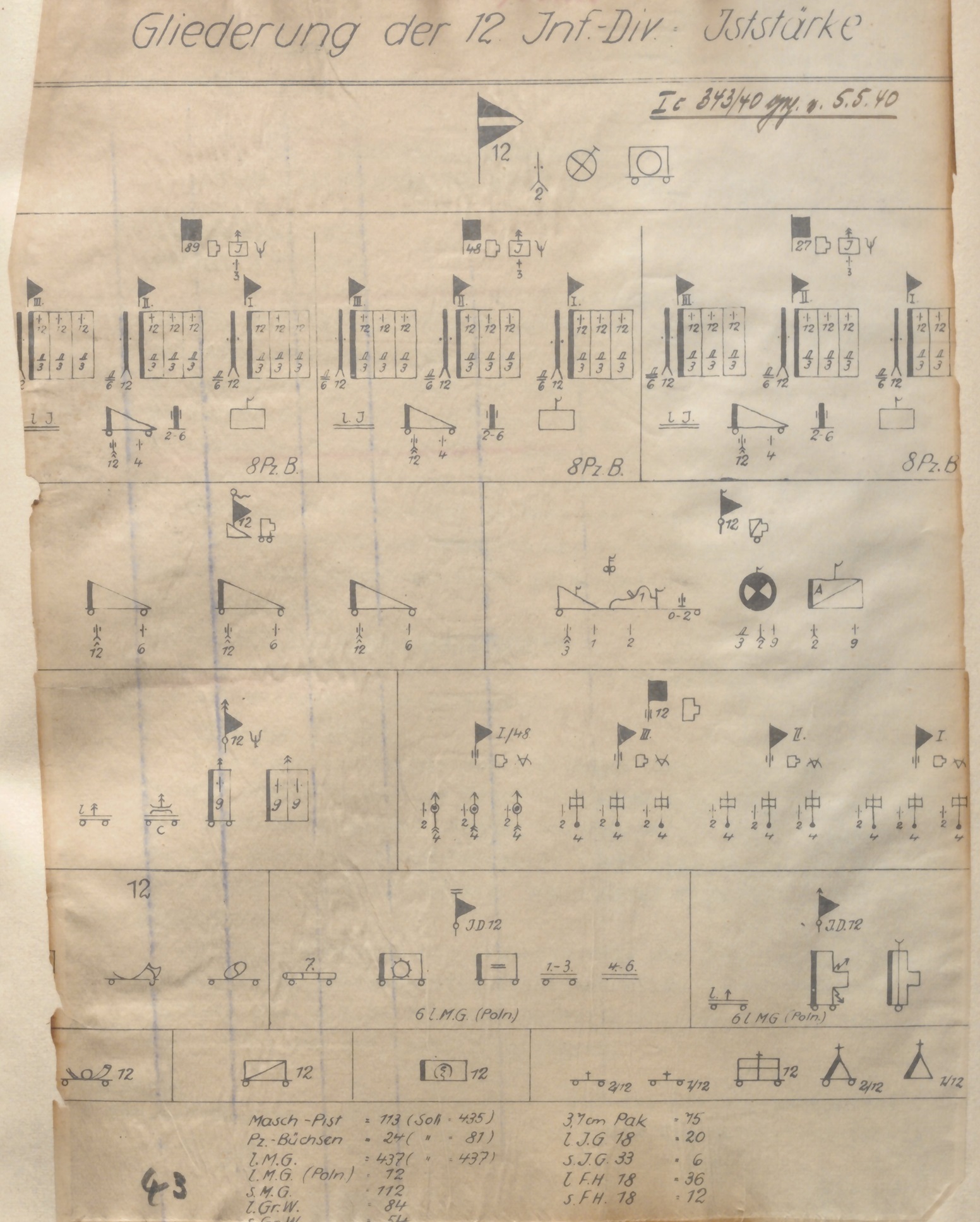 Berlin, den 23.1.1940 Chef H Rüst und BdE AHA Ia(I)Nr.234/40 geh. Betr.: Aufstellung von Inf.Pi.Zügen. 1.) Bei den Inf.Regimentern aller Inf.Divisionen 1., 2.,4.u.5.Welle, welche bisher noch nicht mit Inf.Pi.Zügen ausgestattet wurden, sind umgehend Inf.Pi.Züge aufzustellen. Die Aufstellung muß bis zum 15.2.40 beendet sein. 2.) Inf.Pi.Züge sind also aufzustellen bei den Inf.Regimentern der: 1.,3.,4.,5.,6.,7.8.,9.,11.,12.,14.,15.,16.,17.,18.,19.,21.,23.,24.,26.,27.,28.,30.,31.,32.,33.,34.,35.,56.,58.,61.,62.,68.,69.,75.,76.,79.,86.,87., 251.,252.,253.,254.,257.,258.,260.,262.,263.,267.,269., 93.,94.,95.,96.,98.Inf.Division. 3.) Die Aufstellung erfolgt durch die betr.Inf.Divisionen selbst. 4.) Stärke und Ausrüstungsnachweisung (Inf.Pi.Zug K.St.N.u.K.A.N.Nr.196 Beh.v.30.12.39) gehen anliegend zu. 5.) Das für die Aufstellung erforderliche Personal ist aus den betr.Inf.Rgtern. zu entnehmen. Die hierdurch entstehenden personellen Fehlstellen sind durch Abgaben von Mannschaften der zuständigen Ersatzeinheiten aufzufüllen. 6.) Der Inf.Pionierzug erhält das Pioniergerät aus dem Inf.Rgt.bisher für Pionierarbeiten zugeteilten Gerät und zwar 9 kl.Floßsäcke 1 Satz großes Schanzzeug Spreng-und Pioniergerät Einzelheiten gehen aus den K.A.N. hervor. Die Zuweisung von Gasspür- und Entigftungsgerät wird durch Sonderverfügung durch OH(Ch H Rüst u.BdE) AHA -In 9 geregelt. 7.) Die erforderlichen 5 Fahrzeuge mit 10 Zugpferden, 5 Fahrern v.Bock und 5 Wagenbegleitern sowie 1 Reitpferd sind der Inf.Kolonne zu entnehmen. Die Stärke der l.Inf.Kol.wird um diese Abgaben gekürzt. 8.) Als Ersatzeinheiten für die Inf.Pionierzüge sind die Ersatzbataillone der entsprechenden Regimenter zuständig. 9.) Die beendete Aufstellung ist an OKH - Chef H Rüst. u.BdE AHA Ia(I) zu melden. |