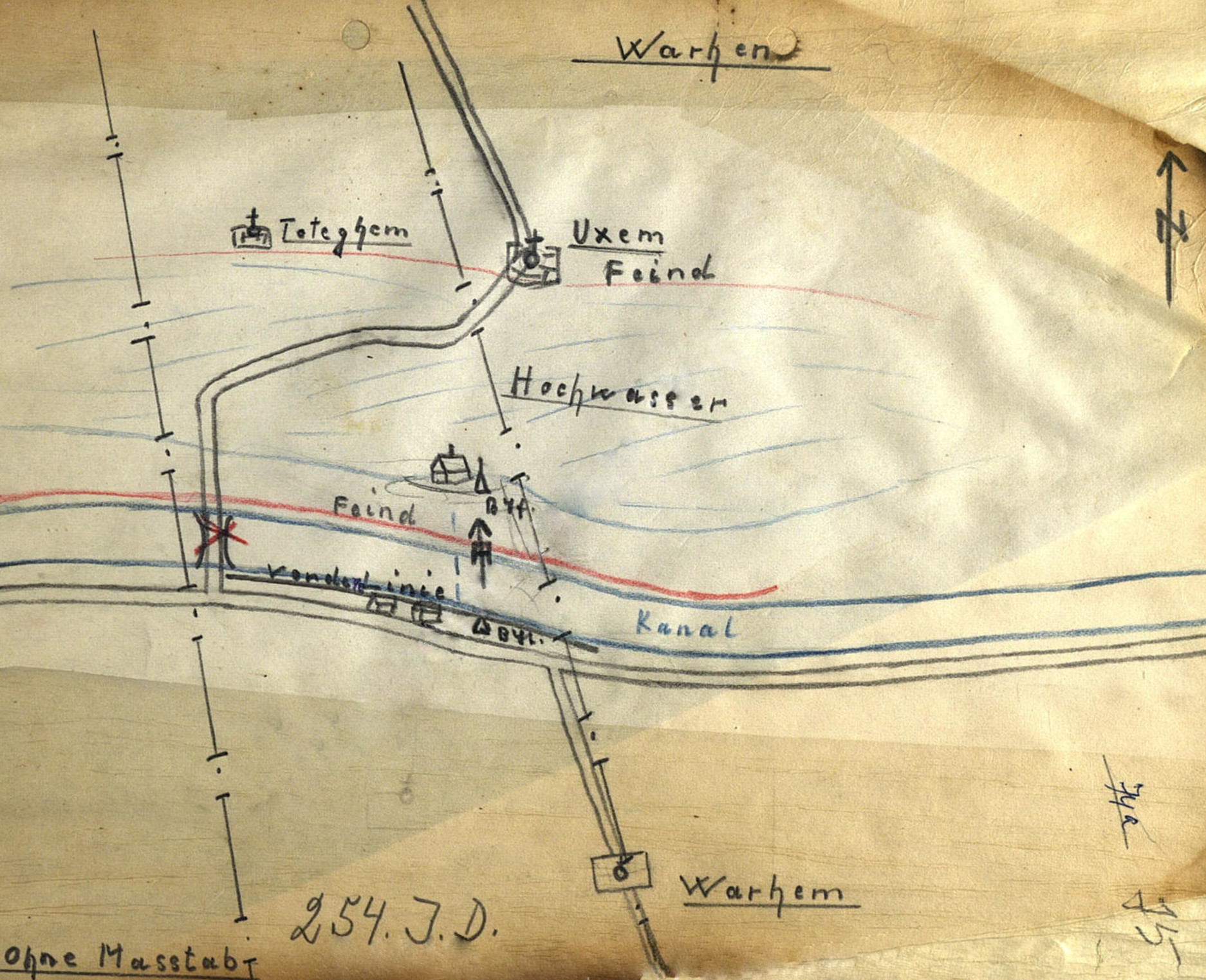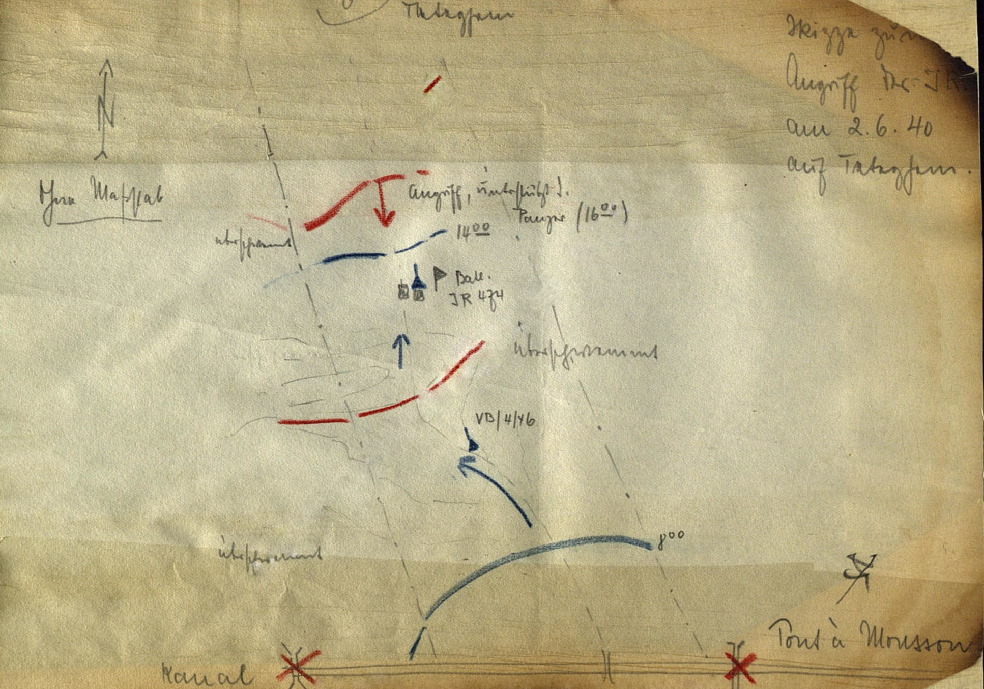 Sturmabzeichens (4./A.R.46) Der Angriff wurde mit einem Battl.vom Brückenkopf westl. a´Mou-unleserlich- auf Teteghem vorgetragen. Hart Südl.les Moeres stieß das Battl. auf heftigen Widerstand und erreichte kämpfend als vordere Linie -unleserlich-ser auf der Höhe südostw.N.D. des Neiges. Die Flanken des Battl.s waren rechts und links ungedeckt. Am Spätnachmittag führte der Feind mit 10 mittl.Kampfwagen und Infanterie einen Gegenstoß durch -unleserlich- Feuer der Pak und der schw.Artillerie zusammenbrach. 4./A.R.46 war dem Battl.als Sturmartillerie zugeteilt. Der Gefr.Schelshorn war dem vorgesch.Beboachter als Funker zugeteilt. Durch seinen unerschütterlichen Einsatz hatte er an der Abwehr des feindl.Panzerangriffes wesentlichen Anteil. Weiterer Bericht: Das I.R.474 griff am Morgen des 2.6.40 die feindliche Stellung vor Teteghem an.Ich war als Funker beim Vorg.Beob.den der damalige Wachtmeister Degenkolb als Hilfsbeobachter zugeteilt war. Südlich von les Moeres stießen wir auf starken feindlichen Widerstand und erreichten mit den vordersten Infanterieteilen die vorderen Häuser der Höhe südostw.N.-unleserlich-des Neiges. Ein Btl.des I.R.474 bei dem wir uns befanden hatte einen Keil in die feindliche Front getrieben. Am Spätnachmittag unternahm der Gegner einen Gegenstoß unterstützt von 10 mittl.Panzern und starken Infanteriekräften. Der Vorg.Beob.unterstützte durch gutliegendes Feuer die eigene Infanterie wodurch der Gegenangriff zum Stehen kam. 2 der fdl.Panzer wurden ausser Gefecht gesetzt. Weiterer Bericht: Der Angriff wurde mit einem Batl.vom Brückenkopf westlich von a´Moutons auf Teteghem vorgetragen. Hart südl. les Moeres stieß das Batl. auf heftigen Widerstand und erreichte kämpfend als vorderste Linie die Häuser auf der Höhe südostwärts N.D.des Neiges. Angriffsziel des I.R.474, dem Oblt.Lenhard mit seiner Batterie zugeteilt war, war die Erweiterung des Brückenkopfes westlich Pt.-unleserlich- und anschließend die Einnahme von Teteghem. Durch seine in vorderster Linie liegende B-Stelle, die dauernd unter Artl.- und M.G.-Feuer lag, konnt Oblt.Lenhard eine fdl.B-Stelle erfolgreich bekämpfen. Durch weitere Zerstörung von befestigten Häusern und M.G.-Nestern wurde die Infanterie wesentlich unterstützt und konnte den Brückenkopf so erweitern, daß schwere Infanteriekräfte übersetzen konnten. Obltn.Lenhard begleitete den Angriff noch bis auf die -unleserlich- südostwärts N.D.des Neiges, wobei heftiges feinldiches Feuer -unleserlich- gehen behinderte. Auf die Nachricht vom Beschuss der Feuerstellung durch feindliche Artillerie ging Oblt.Lenhard zurück und übergab den Feuerschutz dem Vorg.Beob.Ltn.v.Bray. Skizze |