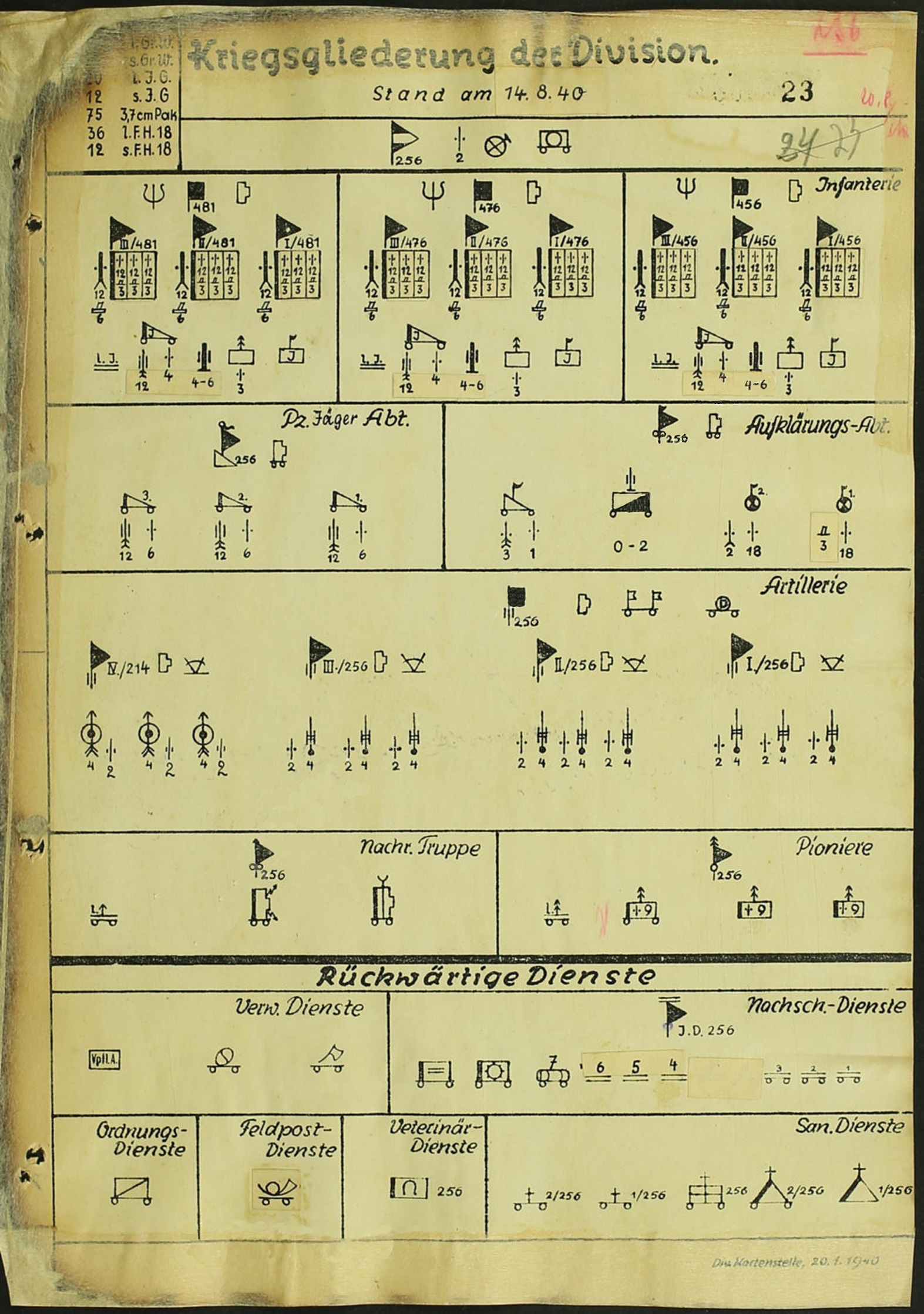 481 (ohne III./I.R. 481.) am 10.5.1940 a) Voraus-Abteilung, 5./(Radfahr)481, verstärkt durch 1 Zug 14./481 1 Kampfwagenzug b) I./481 mit unterstellten: 1 Zug 13./481 Inf.Pi.Zg.481 1 Zug 14./481 1 Zug 1./Pi.256 (Pion.Stoßzug mit Flammenwerfern) c) II./481 (ohne 5.Komp.) mit unterstellten: 1 Zug 13./481 1 Zug 14./481 Inf.Pi.Zg.476 d) III./481 mit unterstellten: 1 Zug 13./481 1 Zug 14./481 (ohne Pferde und Fahrzeuge) bereitgestellt zur Verladung auf Truppentransportzug. |