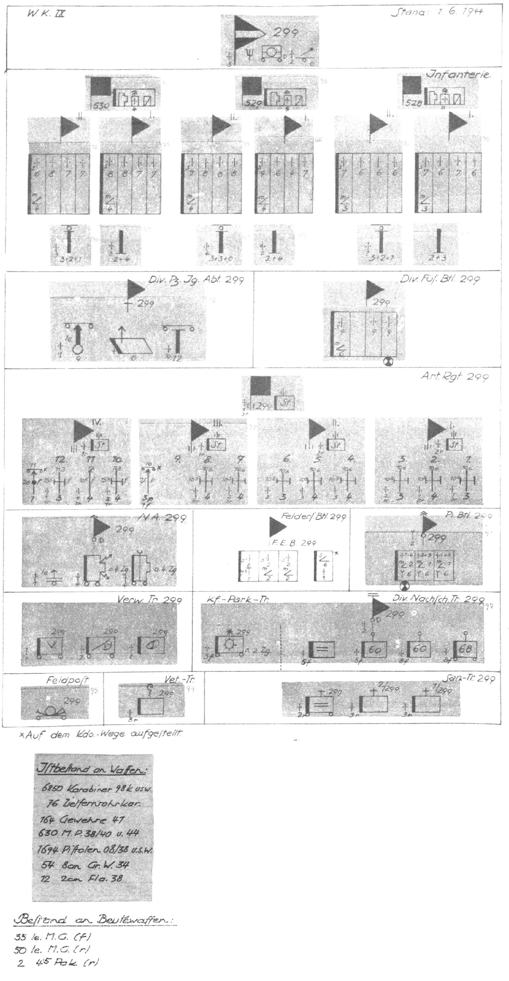 Heresgruppe A Bei Abtransport der 299.I.D. nach dem Osten ist das Pi.Btl.299 bei der 1.Geb.Div. zu belassen. |