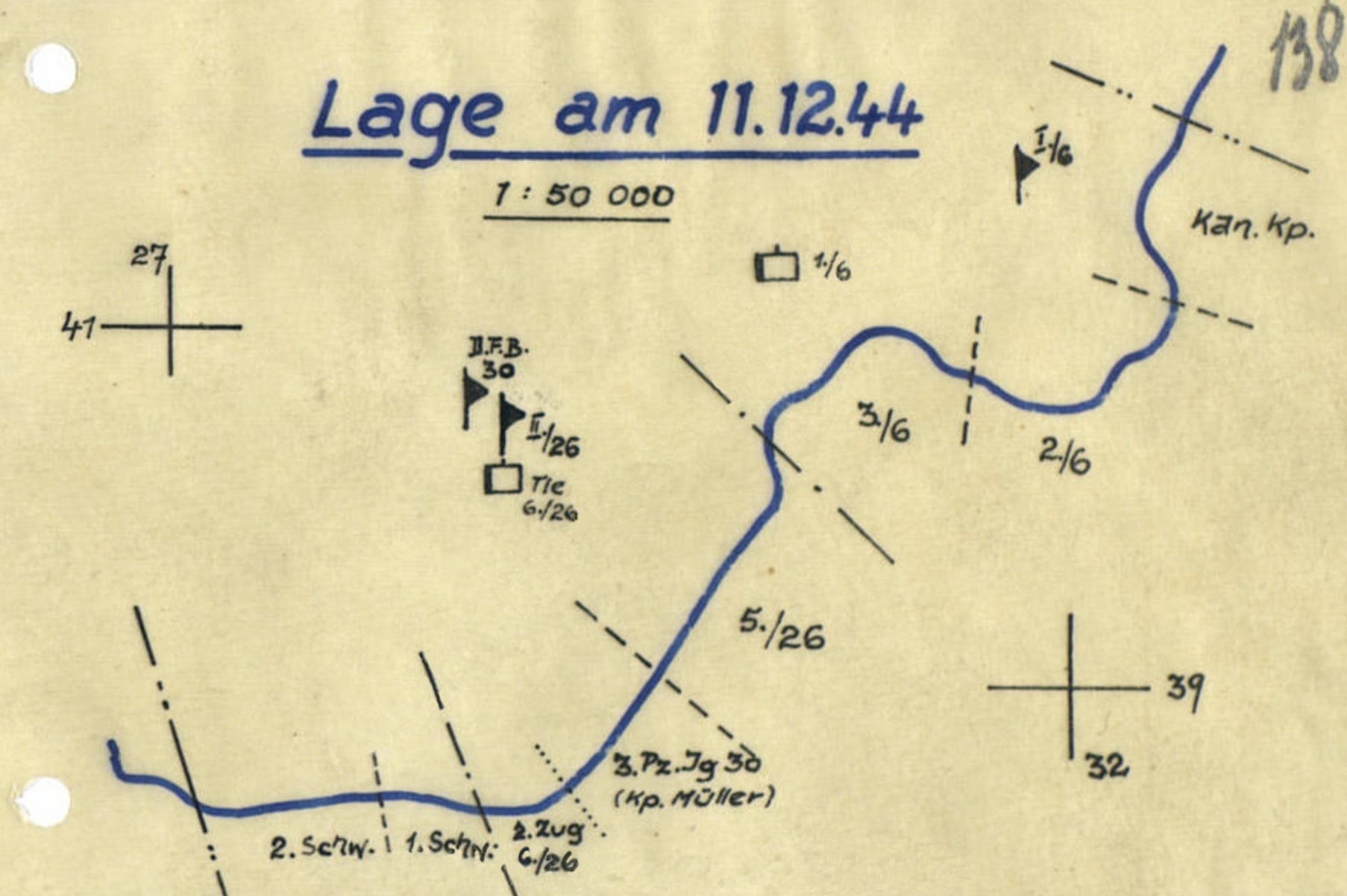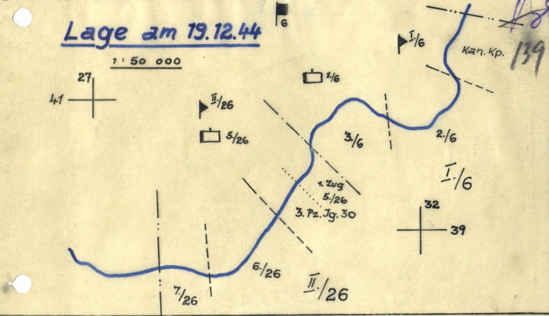 Gruppe Thomaschki, IA-Morgenmeldung, 19.12.1944. .... 30.I.D.: Ruhiger Verlauf der Nacht bei während der Dunkelheit regem Inf.-Störungsfeuer und lebhaftem GrW.,I.G..-, und Pak-Beschusses besonders im Raum G.R.6. Eigener Spähtrupp vor Melderaum 192 e bestätigte bisheriges Feindbild. 20.00 Uhr wird ein Flugzeug über Feindgebiet südlich Melderaum 208 von Flak beschossen. Div. - Ic - Tagesmeldungen vom 19.12.1944. 30.I.D. A 1: Nachts lebh. Inf.-Störungsfeuer, tagsüber ruhig. Feindbild unverändert. A 2: Eig. Spähtrupp bestätigte Feindstellungen und Besetzung in DL 3a. In EL 1c erstmalig MG- und Gewehrschützen festgestellt., wurden durch eig. Art.Feuer zum Schweigen gebracht. 3. Eig.Spähtrupp stellte 1 km weiter ostwärts Gangbarkeit des Tirs-Sumpfes fest. In FK 8c lief vermutlich vorgehender Feindspähtrupp auf eig. Minen. In FK 5b schanzt Feind wieder die ganze Nacht hindurch. Feindverkehr: 19.15 Uhr Abfahrt 1 Zuges aus Skuodas.- Vereinzelte Kfz. und Bespannfahrzeuge von Norden nach Skuodas. Vormittags geringer mot-Verkehr bei Gederti. Einzelne Bewegungen in DK 8b, FK 5d und FK 2d. A 3: 22.30 Uhr fdl. Flugzeug in EL 2 ausfliegend. 10 - 11 Uhr 2 Feindmaschinen über Ostfront der Div. Während des ganzen Vormittages Geräusche von Flugzeugmotoren aus dem Raum EM 7 - 8. E : 1 Scharfschüzenabschuss. 1 Pak vernichtet (Nachmeldung zum 18.12.24.) Beschuß: 200 GrW, l00 Pak. .... STREIFENMELDUNGEN: 30. u. 87.I.D. K.b.V. 32.I.D.: 7 Überwachungsstreifen, l0 Überwachungsposten. - 4 Wehrmachtangehörige ohne Soldbuch u. 2 Zivilisten festgenommen. Die Soldaten wurden von ihren Einheiten abgeholt, ein Zivilist wieder auf freien Fuß gesetzt. Der 2.Zivilist, ein Pole, wurde noch festgehalten. KTB Gren.Rgt.6. Die Herauslösung des D.F.B. verlief planmässig. Am Tage lag mässiges Gr.W.- und Pakfeuer auf dem gesamten Abschnitt. 6.00 - 7.00 Uhr Schanzarbeuten des Gegners im Raum Gusticki. Beobachtungen ergaben Schanzarbeiten von etwa 40 Mann auf Höhe 49,9 sowie leufenden Einzelverkehr von besp.Fahrzeugen in diesem Raum. Um 14.30 Uhr wurde vor Mitte II:/26 Geräusche mehrerer von Kukaliai nach W.W. fahrender Lkw. gehört. Um 23.00 Uhr Flugzeuggeräusche über der HKL. Lt.Rönnpag, Ord.Offz.G.R.6 wurde für einige Tage zu dem der 30.Inf.Div. unterstelltem Rgt.z.b.V.185 (Stab) als OI kommandiert. |