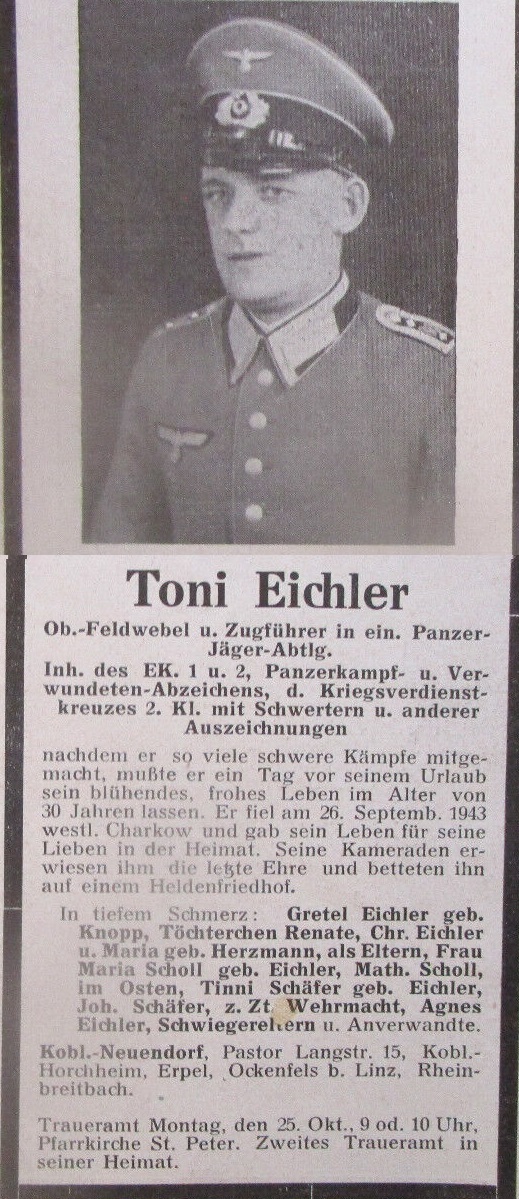 | Eichler Anton | 26.9.43 gefallen Grebeni (Dnjepr), Gr.Spl.Rücken (Ofw.), Grablage 200m nordwestl.v.Weiher in Chaltcha, 20km westl.Rschischtew | geb. 6.5.13 | ||