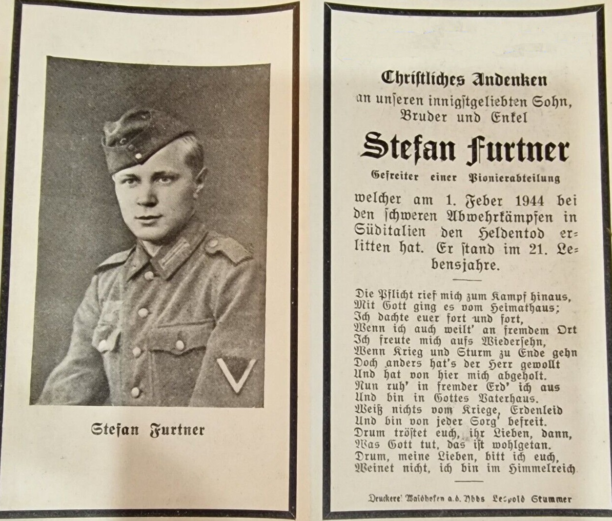 | Furtner Stefan | 1.2.44 gefallen Terelle, A.G.re.Bein, "konnte nicht gebirgen werden" (Gfr.); | ||