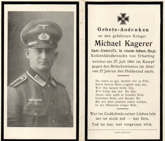 | Kagerer Michael | 27.7.41 gefallen Kalinowka, I.G.Obersch.u.Hoden (Uffz.), Grablage Nordteiul Kalinowka; | geb: 4.5.14; | ||