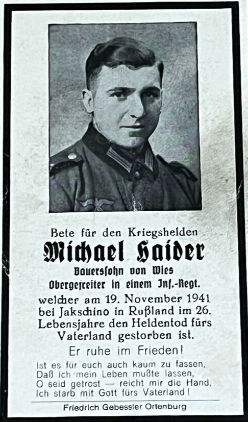 | Haider Michael | 19.11.1941 gefallen Golowkowo, I.G.Kopf (Obgfr.); Grablage Jumatowo; | |||