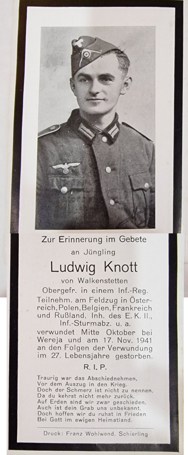 | Knott Ludwig | verwundet 19.10.41 bei Wereja, 1.05 Uhr verstorben Feldlaz.7 Wereja, Schlüsselbein, Schulter, Infektion (Obgfr.); | |||