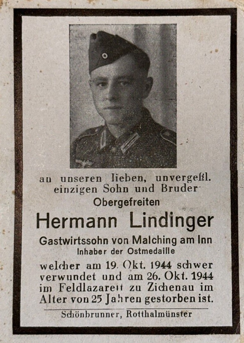 | Lindinger Hermann | 19.10.1944 schwwer verwundet, 26.10.1944 im Lazarett Zichenau verstorben (Obgfr.); | |||