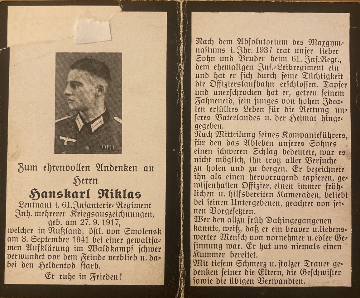 | Niklas Hanskarl | 3.9.1941 verwundet u.verst. östl.v.Smolensk (Lt.) (Gräberkartei, Volksb.negativ);; | |||