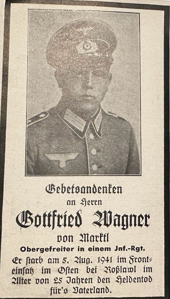 | Wagner Gottfried | 5.8.1941 gefallen A.G.Br., Sklimin (Gfr.), Grablage 1km nordw.Miloslawitschi, geb.7.12.16; | |||