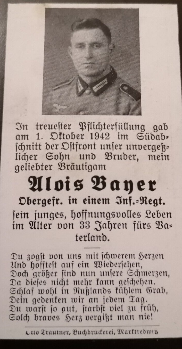 | Bayer Alois | 1.10.42 gefallen Noworossisk, Mine, Kopf, Hals (Ogfr.), Grablage Noworossisk; | geb.18.9.09 | |