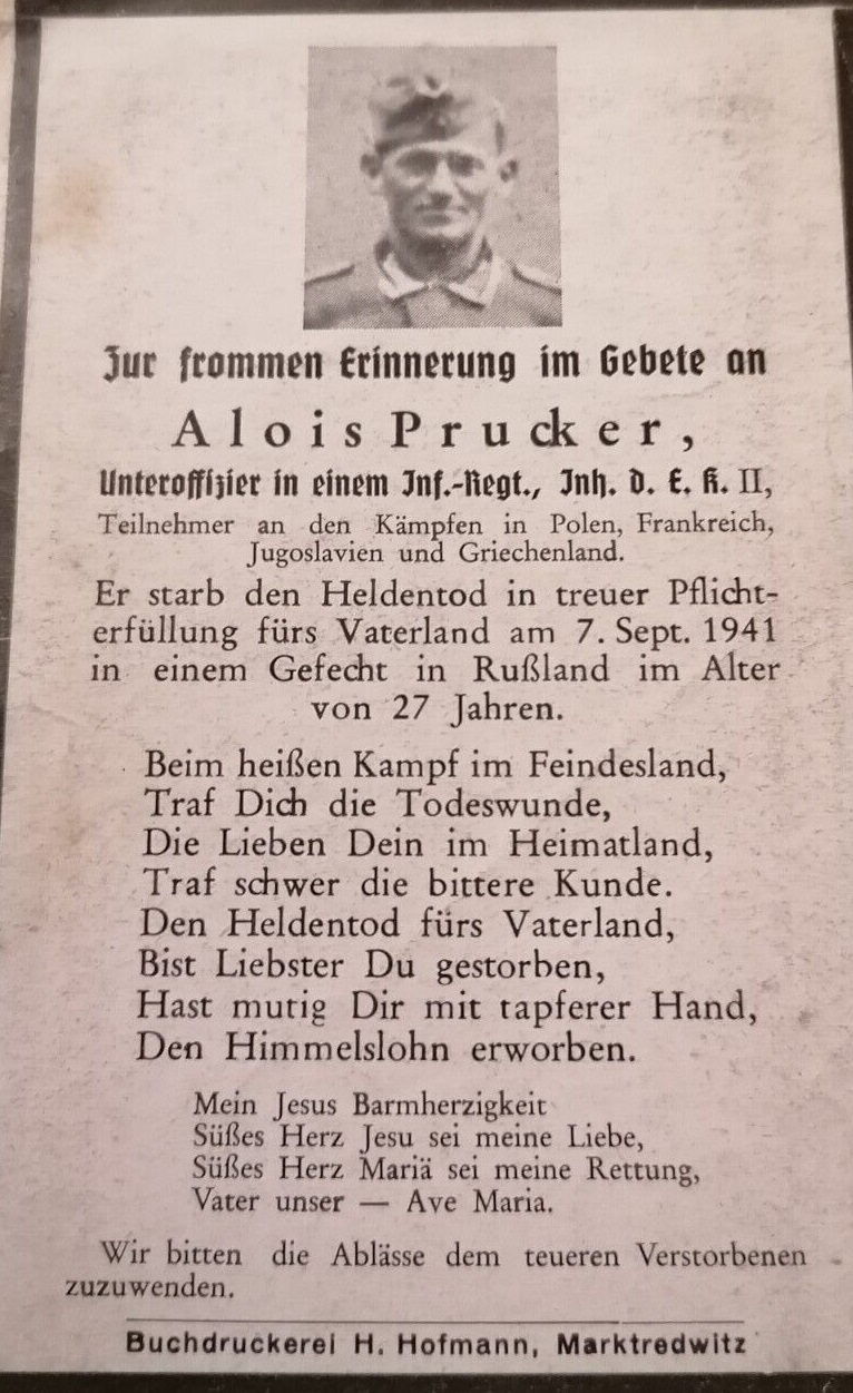 | Prucker Alois | 7.9.41 gefallen Mogila Wissokoja, Gr.Spl.(Uffz.) | geb.31.5.14 | |