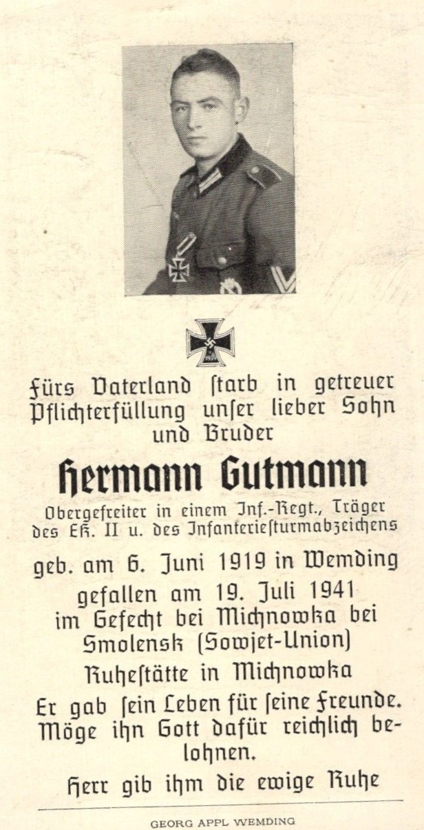 | Gutmann Hermann | 19.7.41 gefallen Michnawka, A.G.K.+Br.(Ogfr.), Grablage Einzelgr.500m westl.d.Senke b.Michnawka; | geb.: 6.6.19 | ||