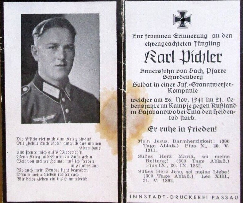 | Pichler Karl | 26.11.41 Barabanowo gefallen Fl.B.Brust (Schtz.); | geb.: 1.11.21 | ||