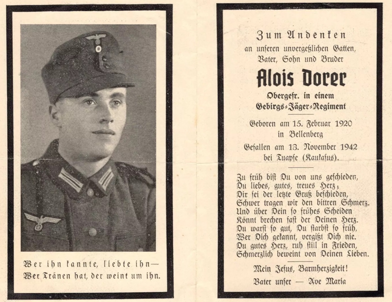 | Dorer Alois | 12.11.42 gefallen Pkt.674 - 23km nordostw.Tuapse, l.u.r.Schulter (Ogfr.); Grab 2km nordwestl.Ssemaschiha-Pass Grab Nr.21; | |||