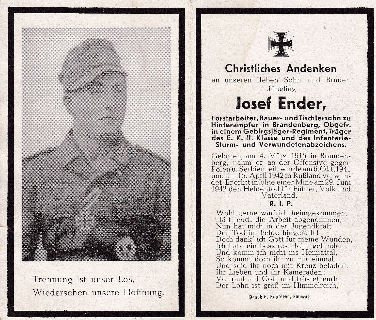 | Ender Josef | 29.6.1942 gefallen bei Minenunfall Westrand Nowi Donbass (Obgfr.); Grablage Heldenfrdhf.Nowi Donbass 6.Rh.,Nr.4 rechts; | |||