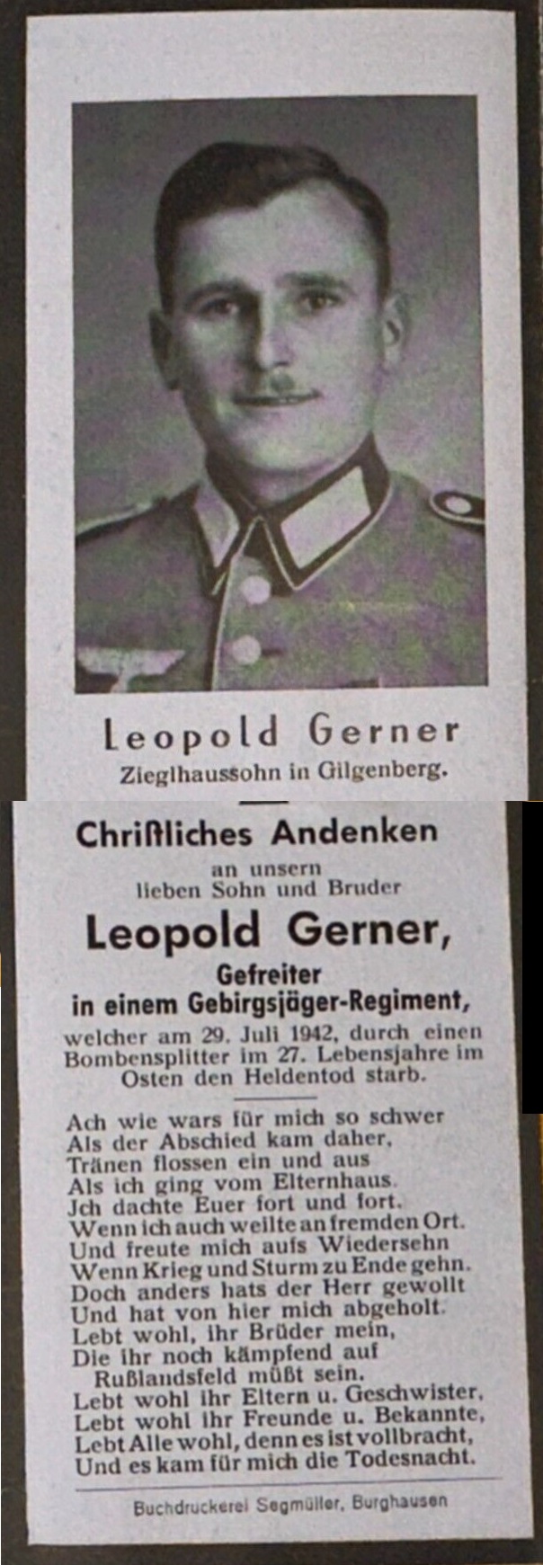 | Gerner Leopold | 29.7.1942 gefallen Bomb.Spl.Kopf, Rostow (Gfr.); Grablage Rostow; | |||
