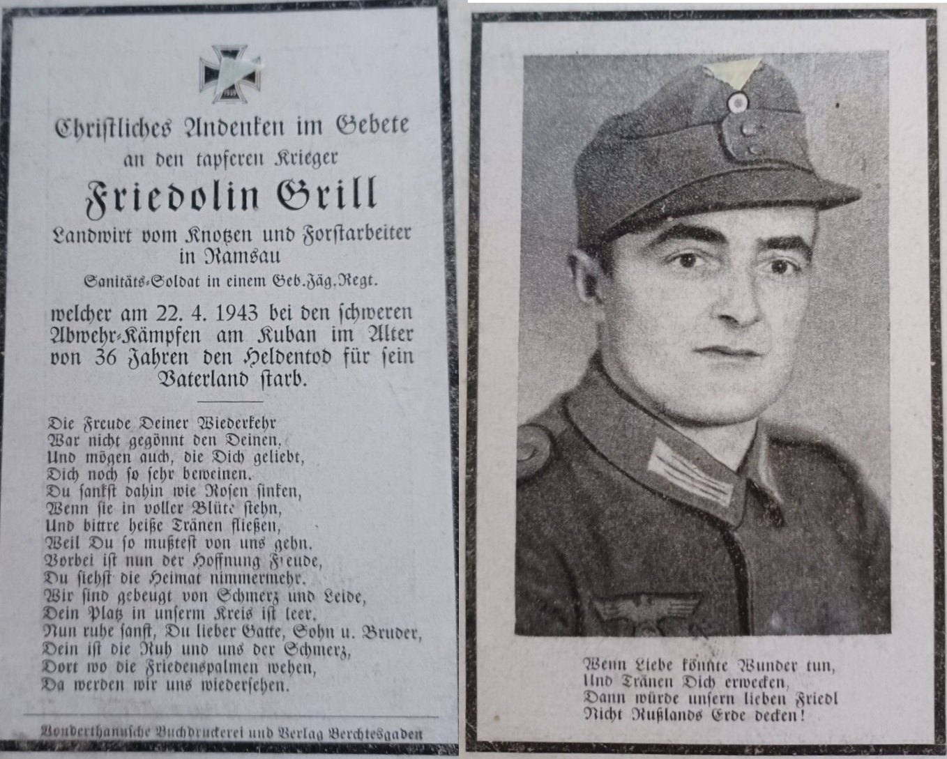 | Grill Friedolin | 22.4.43 gefallen Schirokaja-Schlucht, 7km südw.Noworossijsk, Bomb.Spl.(San.Sold.); | geb. 1.6.1907 | ||