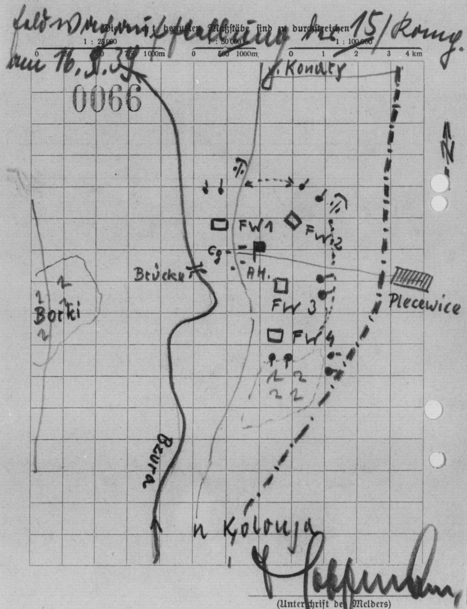 Funkspruch (Nr.0139) I.Btl. an I.R.A.H., 9./10.9.39, nachts I.Btl. hat linke Strasse Oltarzew - Domaniew am 9.Sept.22.00 Uhr erreicht. Seit 23.00 Uhr im Feuergefecht mit von Westen zurückweichenden starken polnischen Truppen. Btl.Gefechtsstand Ziegelei am Bahndamm und Straße Oltarzew - Domaniew im selben Abschnitt sichert am 9.9. II./I.R.33. Neuer Gefechtsstand kommt vor Mittag noch durch. |