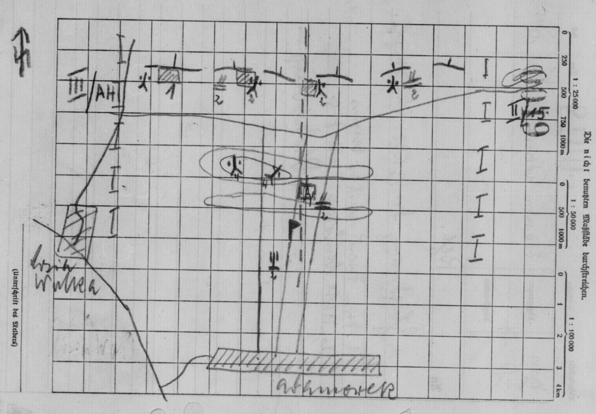 2te Meldung verst.I./I.R.A.H. an I.R.A.H., 1.9.39, 2.20 Uhr Osteingang Bischdorf BEtr.Morgenmeldung. Nach Erreichen der bef.Marschziele durch Truppen des Gros wurden sämtl.Fahrzeuge voll aufgetankt. Gros marschbereit. Flieder an Auenfelde, 1.9.39, 3.10 Uhr Kolonnen und Gefechtstroß sofort auf der Straße Konstadt - Skalung - Kekoldsorf(?) - Angersdorf - Kornfelde auf Westausgang Pitschen vor -unleserlich- Meldung über erreichbarkeit nach Auenfelde. Führer Gros verst.I.R.A.H., 3.Meldung, an verst.I.R.A.H., 1.9.39, 5.40 Uhr 05.30 Uhr hat letzt.Marscheinheit Gros (verst.II./I.R.A.H.) Anschluß an II./A.R.46 gefunden. Gros steht auf Straße Baumgarten - Pitschen mit Anfang s.o.Eingang Pitschen. Süd-Eingang Baumgarten -unleserlich- aufgeschlossen und marschbereit. 9.Kp. an Führer Voorhut, 1.9.39 6.07 Uhr, Höhe 199(?) Komp.Verbindung mit Offz.Spähtrupp Schmitt. Schmitt hält Höhe 188 besetzt. Chroscin feindfrei! Verbindung m.Zug Schenkbach hergestellt. Zug Schenkbach hält Höhe 199 besetzt. aus Wojcin schwacher Gefechtslärm vernehmbar. Funkspruch Nr.4 Faust I an I.R.A.H., 1.9.39, 6.10 Uhr Höhe 199(?) bei Gola von eigenen Truppen besetzt. Schwacher Grenzschutz zurückgeschlagen. Gefechtsstaffel an I.R.A.H. 1.9.39, 6.10 Uhr Westausgang Ritschlau(?) (Eisenbahnbrücke südl.Bhf.Ritschau(?). Gefechtsstaffel erreicht um 6.00 Uhr Westausgang Ritschlau (Spitze: Eisenbahnbrücke südl.Bahnhof Ritschlau) Verspätung erfolgte, da Meldung vom I.R.A.H. ausgegeben 3.15 Uhr die Gefechtsstaffel um 4.40 -unleserlich- Beim Vormarsch Straßen verstopft. Funkspruch Nr.6 an I.R.A.H., .9.39, 6.20 Uhr Schwacher fdl.Grenzschutz geht durch Chroscin nach Norden(?) zurück. Funkpruch Spähtrupp, 1.9.39, 6.25 Uhr Boleslawez feindfrei. III.Btl. an I.R.A.H., 1.9.39, 6.30 Uhr Unser Btl.Gef.Stand Nordwestecke Nadelwald bei 188 (500m südl.Chroscin). III.Btl. an I.R.A.H., 1.9.39 6.44 Uhr, Höhe 188 1.) Ob Meldg.von 10.Kp. eingegangen, daß Wojcin feindfrei ist? 2.) Wenn ja, dann bittet Btl. der 10.Kp.noch 1 Pak-Geschütz zugehen zu lassen. Zollhaus Gola an III.Btl., 1.9.39, 6.57 Uhr 1.) 9.Kp. meldet um 6.07 schw.Gefechtslärm in Wojcin. 2.) falls notwendig Pakgeschütz nach Wojcin. Funkspruch Spähtrupp, 1.9.39, 07.03 Uhr Nordausgang Wojcin fdl.Infanteriefeuer. Führer -unleserlich- Pz.Sp.Wagen verletzt. L.A.H. Meldung Nr.1 an XIII.und XI.A.K., 1.9.39, 7.45 Uhr Pkt.188, 500m südl.Chroscin Vorhutbataillon in schwerem Kampf bei Boleslawiez. Ausfälle: 2 Panz.Spä.Wg. Vorhutbtl.stellt sich zum Angriff bereit. Zusätzlich auf der Meldung: Ia antwortet dasß um 7.06 gemeldet worden sei, daß B bereits genommen und Vorauabtlg.auf dem Weg nach Wieruszow sei. Funkspruch vermutl.15.Kp. an III./A.H., 1.9.39, 8.40 Uhr 300m ostwärts Kirche Wojcin. Sicherungen mit Teilen der 15.Kp. nach Osten -unleserlich- ausgestellt. Im Abschnitt nichts -unleserlich- L.A.H.Meldung Nr.3 an XIII.A.K., 1.9.39, 9.00 Uhr Nach Meldung des III.Btl. scheint Boleslawez nach Ortskämpfen in unserer Hand zu sein. Stärkerer feindl.Widerstand: Piaski - 166. Starke Panzersicherung: Pkt. 150 (nördl.Piaski) - 166. Rgt.stellt sich zum Angriff bereit mit 2 Btl. in vorderster Linie. Beiderseits der Vormarschstraßen. I.Btl.bleibt zur Verfügung bei Gola. Angriff: nach Art.-Vorbereitung wahrscheinlich 9 Uhr 30 Min. Ausfälle: 2 schwere Panzer Späh Wagen durch -unleserlich-! Fernspruch Verb.Offz.b.St.A.H. an XI.A.K., 1.9.39, 9.00 Uhr Abgegangen Punkt 188, 500m südl.Persdin(?) Vorhutkomp.hat Nordausgang Boleslawez erreicht. Feindl.Besetzung (Stärke unbekannt) Südausgang Plaski Pkt.166 Regt.Adolf Hitler stellt sich mit 2 Btl.zum Angriff auf Boleslawez bereit, Angriffbeginn etwa 9.30 Uhr. Über genaues Feindbild Unklarheit. Spähtrupp 2 an I.R.A.H., 1.9.39, 9.45 Uhr Kradmelder mit Feindlage unterwegs. Bitte Ersatz Panzerführer bereitzustellen. Sicherungen eingenommen. Starke Kavallerieaufklärung -unleserlich- Verbindung mit Stolina (10.Kp.) -unleserlich- wenn Vorhut weiter vorgeht weitere Befehle. Meldung Nr.6 I./I.R.A.H. an I.R.A.H., 1.9.39, 10.17 Uhr Verst.I./I.R.A.H. (ohne 2.Kp. u.1 Zg.4.(M.G.)Kp.) tritt aus flüchtiger Bereitstellung in Nordostteil des Waldes nordostw.Gola um 10.17 Uhr zum Angriff auf befohlenes 1.Angriffsziel (Bahnst.ostw.Chotynin an) Munition voll! 1.) Btl.Gef.Std.Wald südl.Ostausg.Chroscin nach Überwinden Weg Chroscin - Wojcin. 2.) Btl.Gef.Std.Birkenwald hart nordostw.Ostausgang Chroscin. Fernspruch II./A.R.46 an I.R.A.H., 1.9.39, 10.30 Uhr Feuerüberfall auf Wieruszow abgefeuert. III./I.R.A.H. an I.R.A.H. Poleslawez, 1.9.39, 10.30 Uhr 1.) II.Btl. Gef.Stand Poleslawez Wegekreuz. 2.) 11.Komp. hat Gegner vor sich durch Inf.-Gesch. u.schwere Granatwerfer -unleserlich- niedergekämpft und besetzt jetzt vorliegende Höhe i.g.1000 (?) und gräbt sich dort ein. 3.) 9.Komp. -unleserlich- ebenfalls Anschluß an 11.Komp. nach links in ca.30 Min. -unlesrlich- 4.) 2.Komp.verbleibt nach rückwärts gestaffelt hinter 9.Komp. 5.) Art.B.Stelle in Höhe 2.Komp. wird sofort anfangen auf Gehöfte vor dem Btl. -unleserlich-. Verbindung zum III.Btl. vo Rgt.erbeten. Verbindung vom Btl. zu den Komp.vorhanden. 1.Meldung an 15.Komp.über 10.Komp., 1.9.39, 11.05 Uhr Rgt.Gef.Std.Nordausgang Chroscin. 15.Komp. geht mit kampffähigen Teilen -unleserlich- bisherigen Sicherungsabschnitt so vor, daß sie mit südl. Jaworek führt in der allgem.Linie 174 (500m nördl.Podjawarek) - 175,3 (Zdzary) das Vorgehen des I.Btl. durch die Waldstücke ostw.Meleschin. Voraussichtliches Antreten zum Angriff 12.00. Meldung Nr.7 I./I.R.A.H. an I.R.A.H., 1.9.39, 11.50 Uhr Nordausgang (Chotynin) ostw.Chotynin Verst.I./I.R.A.H. (ohne 2.Kp. und 1 Zg.4.Kp.) ungesicherten Vorgehen über Straße Boleslawecz - Wogcin hat 11.30 Uhr (Chotynin) ostw.Chotynin sowie (Bolast) ostw.Cholynin sowie (Bolest) hart ostw.Nordausgang Chotynin überschritten und geht mit 3./I.R.A.H. auf Wieworka und 1./I.R.A.H. auf (Bolest) nördl.cm74(?) vor. Anschluß zur 2.Kp. links, sowie 10.Kp. rechts vorhanden