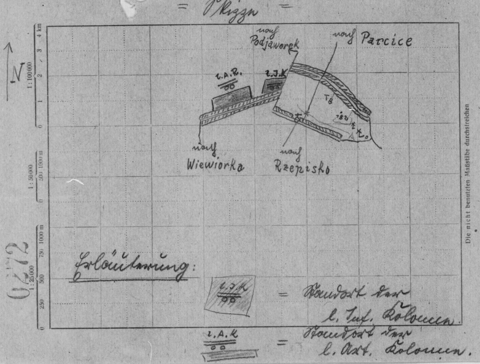 Funkspruch (Nr.0152) Pz.Jg.Zug an I.R.A.H., 8.9.39, 11.13 Uhr Zingalin 3km nordwestl.Rzkow feindfrei. Funkspruch (Nr.0156) Pz.Jg.Zug an I.R.A.H., 8.9.39, 13.47 Uhr Huta feindfrei. Straße gut befahrbar.Wola Rakowa eigene Truppen. Funkspruch (Nr.0157) Pz.Jg.Zug an I.R.A.H., 8.9.39, 13.00 Uhr Huta feindfrei. Straße gut befahrbar. Funkspruch (Nr.0149) an I.R.A.H., 8.9.39, 14.00 Uhr Wola Rakowa von Panzerabwehrabt.18 besetzt.Abteilungsstab Kurowice - Rzadow. 1te Meldung I./I.R.A.H. an I.R.A.H., 8.9.39, 16.25 Uhr Btl.Gef.Std.Feuerwehrhaus Rzgow. Verst.I./I.R.A.H. meldet Einnahme des befohlenen Sicherungsabschnittes ostw.Rzgow. Eingesetzt wurden 1./I.R.A.H., 3./I.R.A.H., 4./I.R.A.H. und 1 Zg.13.(I.G.)Kp. und zwar: auf Höhe nördl.Grodzisko, auf Höhe 206 ostw.Rzgow, auf Höhe südostw.Rzgow. 2./I.R.A.H. in Alarmquartier in Rzgow. Meldung (0161) II./I.R.A.H. an I.R.A.H., 8.9.39, 16.30 Uhr 1.) Vorgelände feinfrei. Starke Feldbesfestigungen auf Höhe 207 u.222 (so.Chojny) vermutlich unbesetzt. 2.) Vorpostenaufstellung des Btl.sichern Gruppe. 3.) Btl.erbittet -unleserlich- für Paksicherung. Vorschlag st.Gruppe. 4.) Btl.Gef.Std. im Haus an der Ortstafel bei der Wegekreuzung si.Skizze 12te Meldung Gefechtsstaffel an I.R.A.H., 8.9.39, 18.10 Uhr Westeingang Wald Zaradzynska l.Inf.Ko., l.Art.Kol.(Kol.6./A.R.46) Gepäcktroß (Rgt.-Stab u.III.Btl.) stehen wie befohlen am Westeungang von Wald Zaradzynska. Wrrkstattzug im Wäldchen, 2km nordostw.Lask und arbeiten. I./I.R.A.H. an I.R.A.H. Verlustmeldung, 8.9.39, 19.25 Uhr Btls.Gef.Std. Feuerwehrhaus Rzgow. Das I.Btl. hatte am 8.9.1939 keine Verluste! Tagesmeldung: Ab 11.30 Uhr marschierte das verst.I./I.R.A.H. ab Westeingang Pabjanice nach Rzgow. Eintreffen Pabjanice 13.30 Uhr. Von dort wurden Teile des verst.I./I.R.A.H. (1.+3.Kp., 4.Kp. und 1 Zg.13.(I.G.)Kp.) zur Einnahme des Sicherungsabschnittes ostw.Rzgow eingesetzt. 2./.I.R.A.H. sowie 1 Zg. 14.Kp. in Alarmquartier in Rzgow. Munition: voll aufgefüllt. Verluste: Keine! Btl.Gef.Std.Feuerwehrhaus Rzgow. |