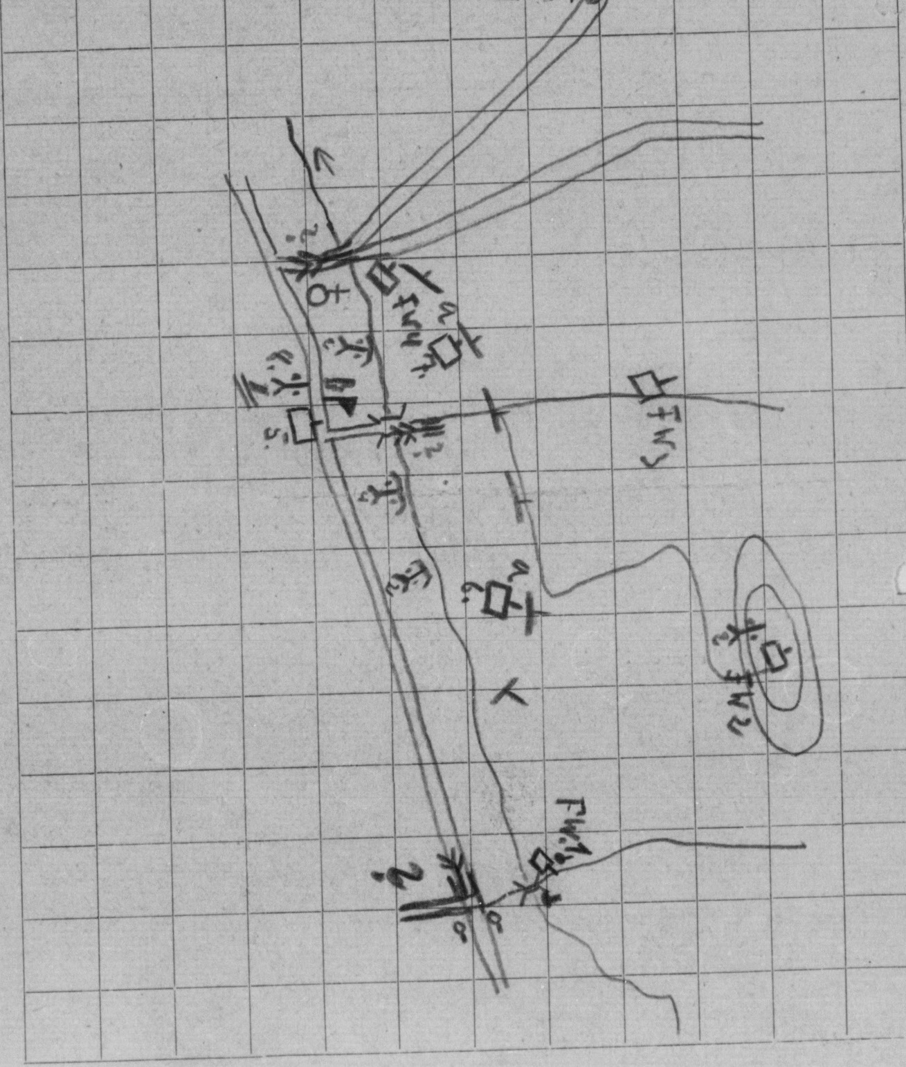 15.Kp. an Rgt.Stab 21.9.39 Als Sicherung setzte die Kompanie ein: 2 Feldwachen - je 1 Zug 1 s.m.G. 2 s.m.G. von der 1.Komp. (Verbindung ist aufgenommen) Skizze Feldwachenstellug der 15.Kp. am 21.9.1939 |