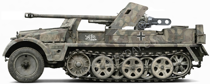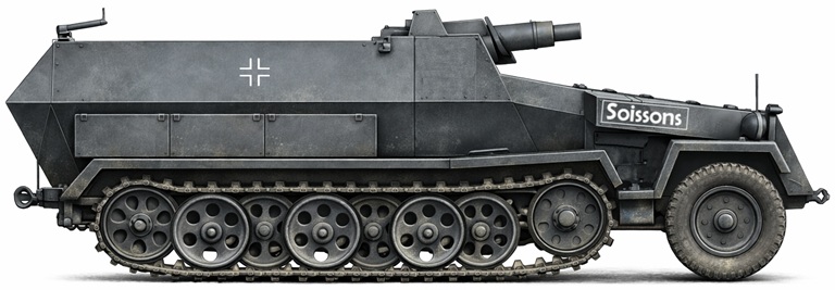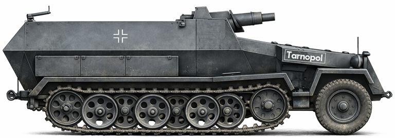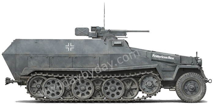 Einheit: vermutlich 26.Pz.Div. Bedeutung: unbekannt Verwendungszeitraum: unbekannt Bestätigung: - Farbe: - ![]() ![]() Ein Sd.Kfz.251/10 mit der Aufschrift Fridericus Rex. Damit ist vermutlich Friedrich II Dieses Fahrzeug trägt das Kennzeichen .WH-1383290 von Preußen gemeint, Friedrich der Große. ![]() ![]() Weitere Sd.Kfz.251/9 mit den Aufschriften Tarnopol und Soissons. Teilaufnahme vermutlich Sd.Kfz.251 mit der Aufschrift Paris |